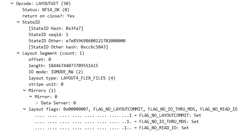 62 9.293307 192.168.56.3 192.168.56.4 NFS 456 V4 Reply (Call In 61) OPEN StateID: 0x1a6a | LAYOUTGET Status: NFS4ERR_BAD_STATEID
